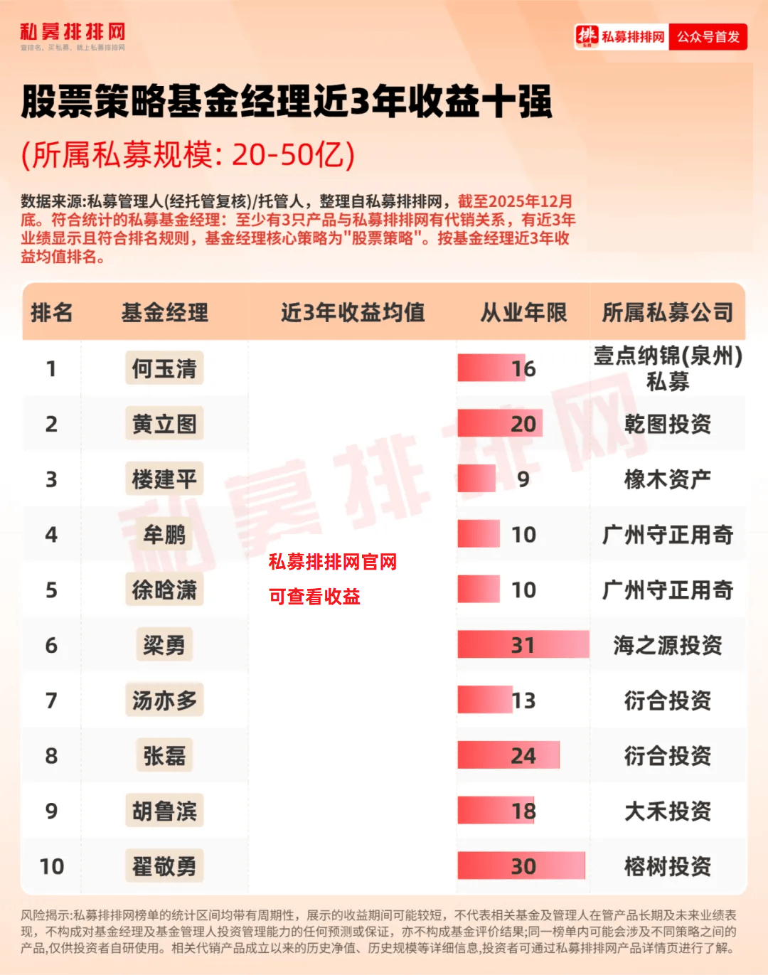 截至2025年末,20-50亿私募旗下基金经理,满足在私募排排网上近3年有3只及以上产品符合排名规则并展示业绩、且基金经理核心策略为“股票策略”的共有29位,平均从业约20.7年,近3年平均回报率为69.30%。