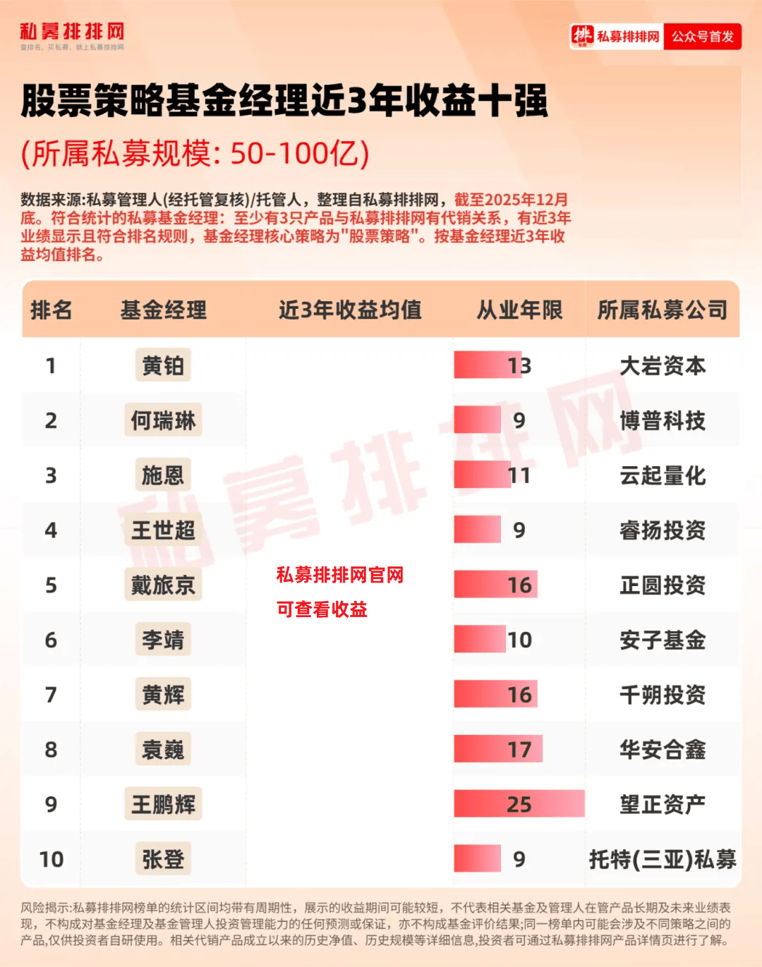 截至2025年末,50-100亿私募旗下基金经理,满足在私募排排网上近3年有3只及以上产品符合排名规则并展示业绩、且基金经理核心策略为“股票策略”的共有20位,平均从业约17.4年,近3年平均回报率为62.24%。