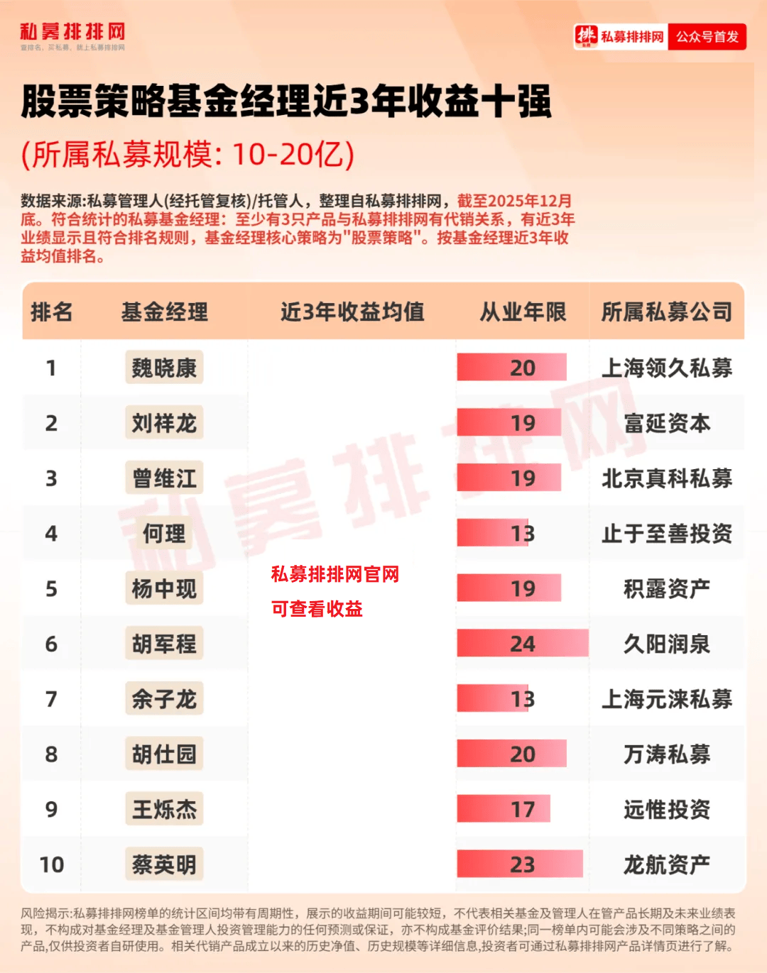 截至2025年末,10-20亿私募旗下基金经理,满足在私募排排网上近3年有3只及以上产品符合排名规则并展示业绩、且基金经理核心策略为“股票策略”的共有24位,平均从业约18.2年,近3年平均回报率为89.91%。