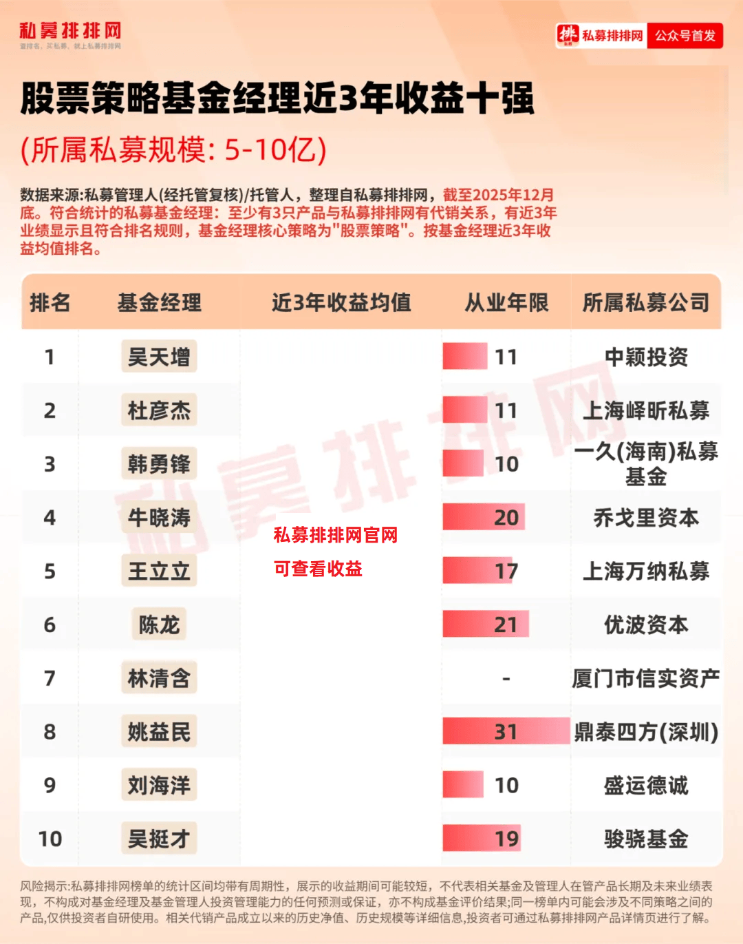 截至2025年末,5-10亿私募旗下基金经理,满足在私募排排网上近3年有3只及以上产品符合排名规则并展示业绩、且基金经理核心策略为“股票策略”的共有33位,平均从业约21.7年,近3年平均回报率为72.48%。